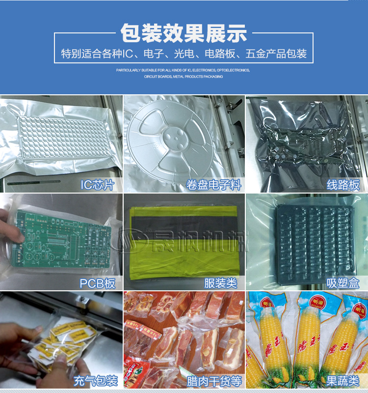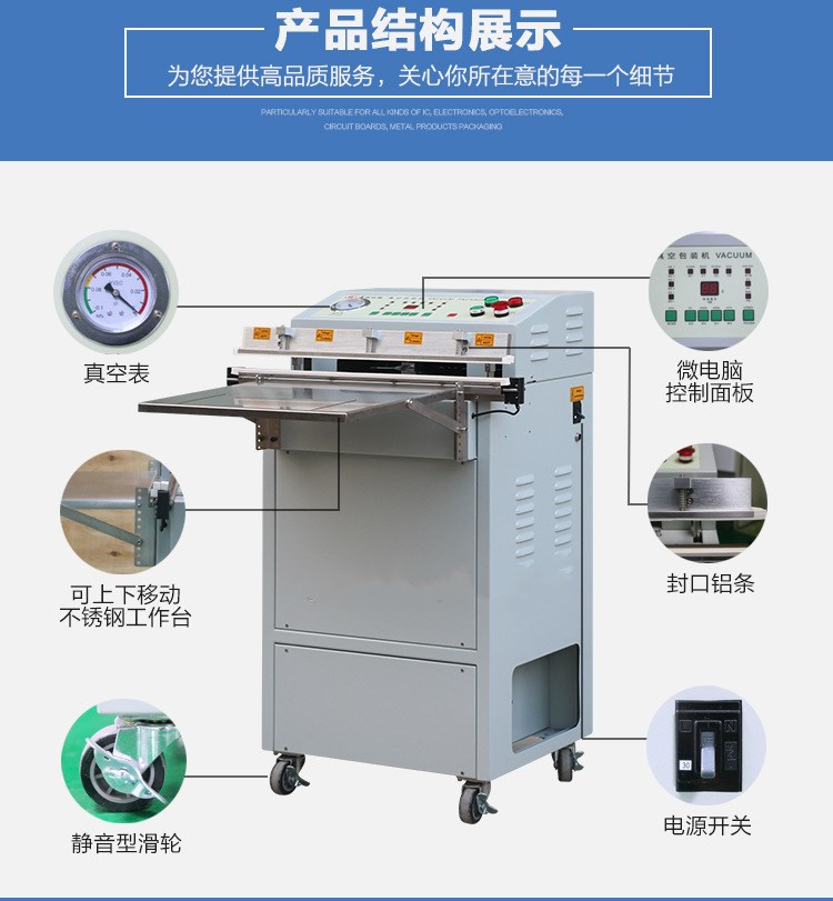 這款外抽式真空機廣泛適用于電子產品,如晶片、半導體、IC、金屬加工件的防潮、防氧化變色等,布料、棉羊毛制品等,進行真空包裝、降低包裝體積,保持原味、新鮮、并可防沖擊。
